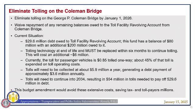 Secretary Miller seeks technical fix to toll-relief law, urges waiver of Coleman Bridge repayment