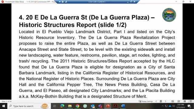 Historic Landmarks Commission accepts Phase 2 De La Guerra Plaza historic‑structure and cultural‑landscape study; two commissioners dissent