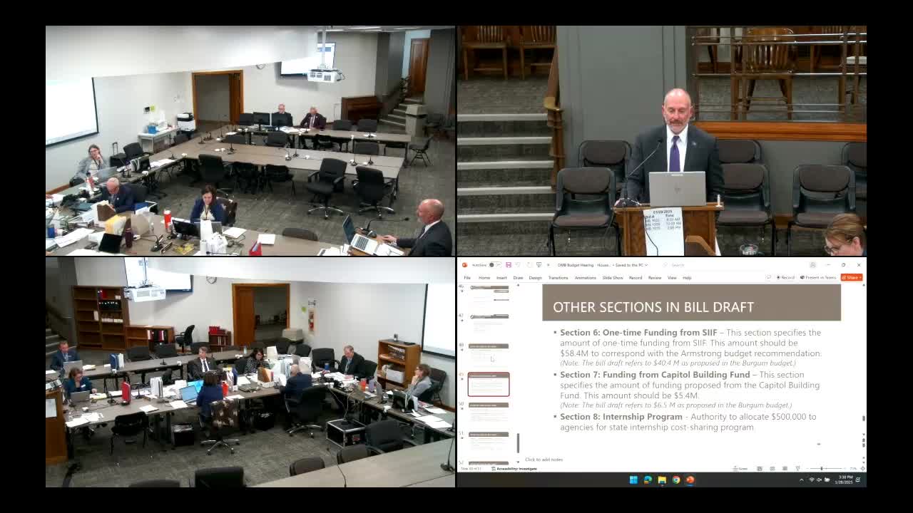 OMB bill draft includes SIF one‑time requests, fund transfers and several statutory sections; committee asks for detail