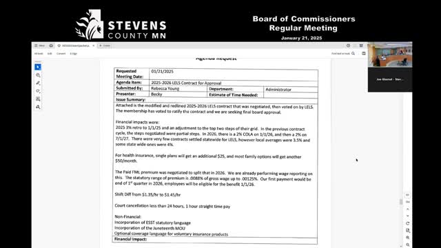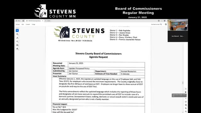 Stevens County ratifies law‑enforcement unit contract and updates county sick‑leave policy to reflect ESST and paid FML changes