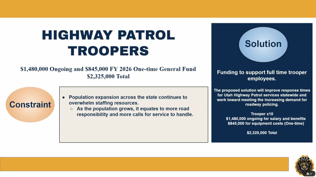 Highway patrol proposes two drug‑interdiction crews, K‑9 teams and specialized equipment tied to HB 87