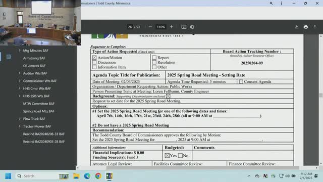 Todd County sets spring road meeting for April 16; decision on $323,573 state-bid plow truck purchase tabled