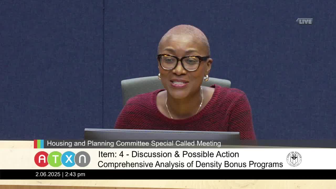 Consultants and staff present comprehensive analysis of Austin’s density‑bonus programs