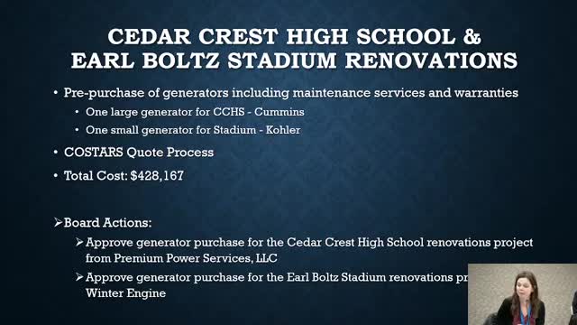 CLSD seeks pre-purchase approvals for long‑lead generators, opens chiller bids and recommends gym floor overpour