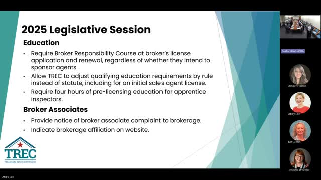 TREC staff outlines bill tracking, and Texas Realtors' proposals to change buyer‑agent rules after NAR settlement