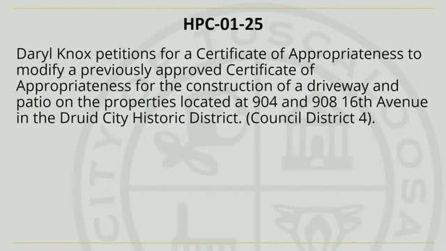 Tuscaloosa HPC approves multiple applications including Oakwood Court driveway and fences; several routine items passed