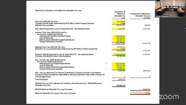 Preliminary 2025–26 tax‑levy limit presented: district estimates 3.11% cap and thin fund balance