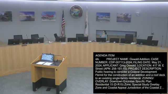 Staff recommends approval of coastal permit for Oswald residence addition in Encinitas; decision pending