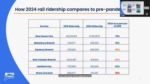 DOT reports ridership gains, new railcars and station projects; Shoreline East constrained by Amtrak and movable‑bridge limits