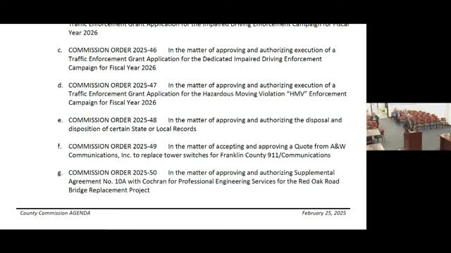 Franklin County commissioners approve traffic-enforcement grants, 911 switch replacement, bridge right-of-way work and liquor licenses