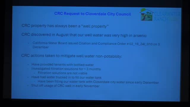 Cloverdale council discusses short-term water assistance for property with arsenic concerns; funding amount referenced