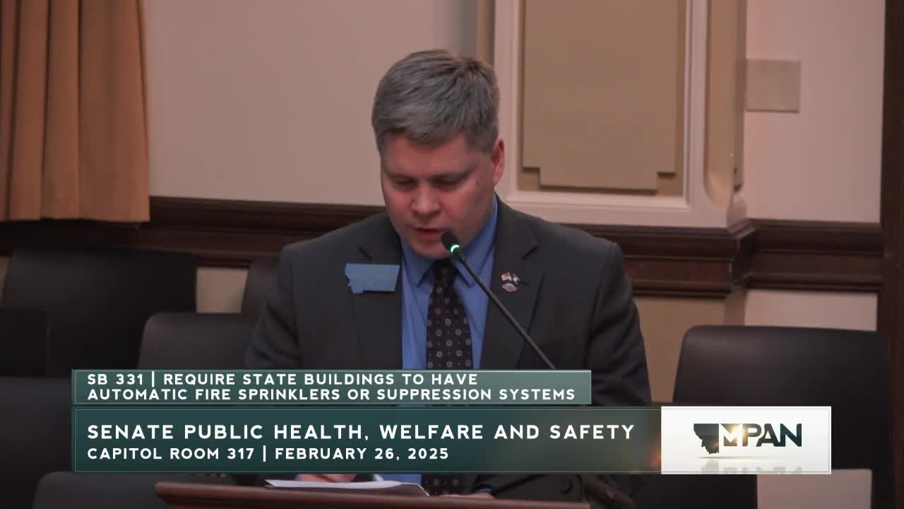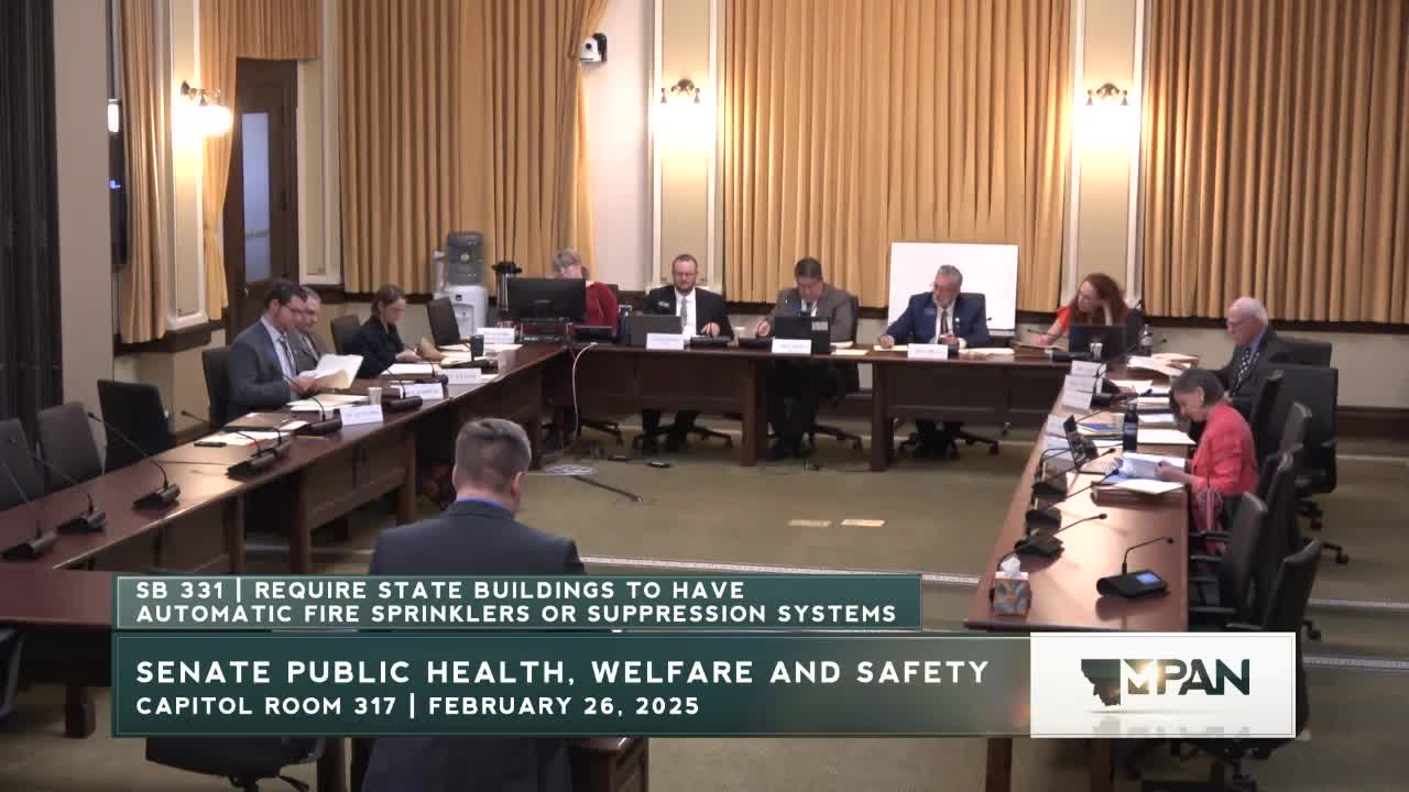 Sponsor argues state buildings should meet modern fire‑suppression standards; fiscal note raises big costs