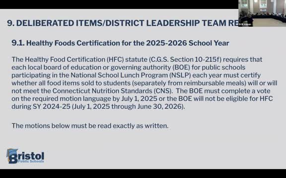 Bristol Board of Education approves school calendars, healthy‑food certification and several curriculum updates