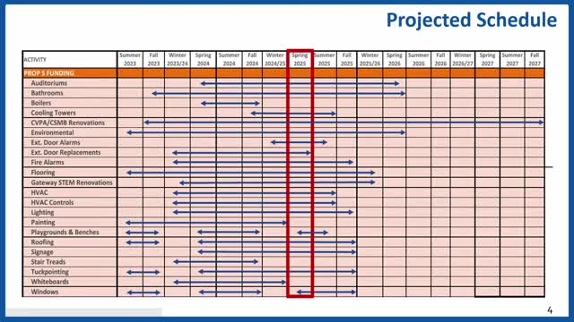 Prop S projects and district fixed‑asset inventory updated for board; many facilities shown before/after