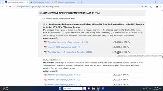 Waunakee board approves budget planning, facility work, Title IX policy updates and consent items; roll-call on bond sale