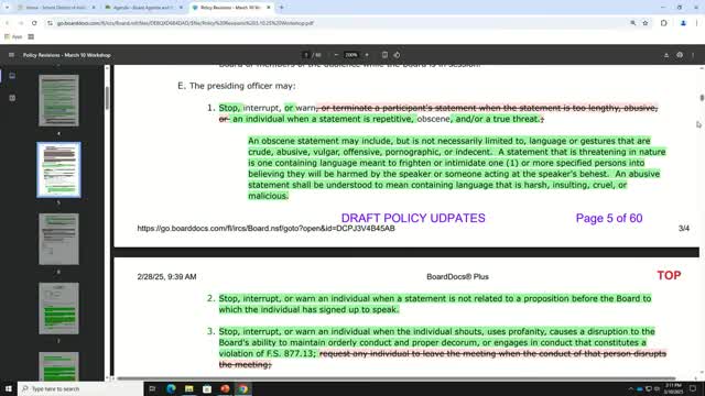 Board revises public-input drafts; debate centers on group speakers and profanity enforcement