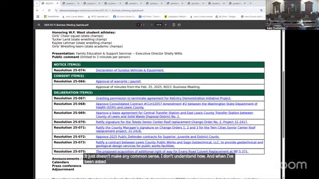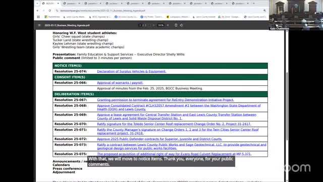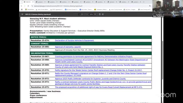 Lewis County commissioners approve routine and contract items, including senior center repairs and road right‑of‑way acquisition