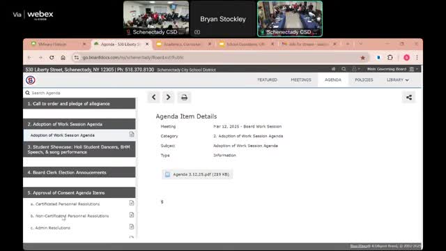 Board adopts work-session agenda; approves consent items and reminds public of May 20 budget vote and elections