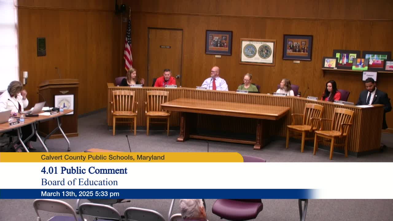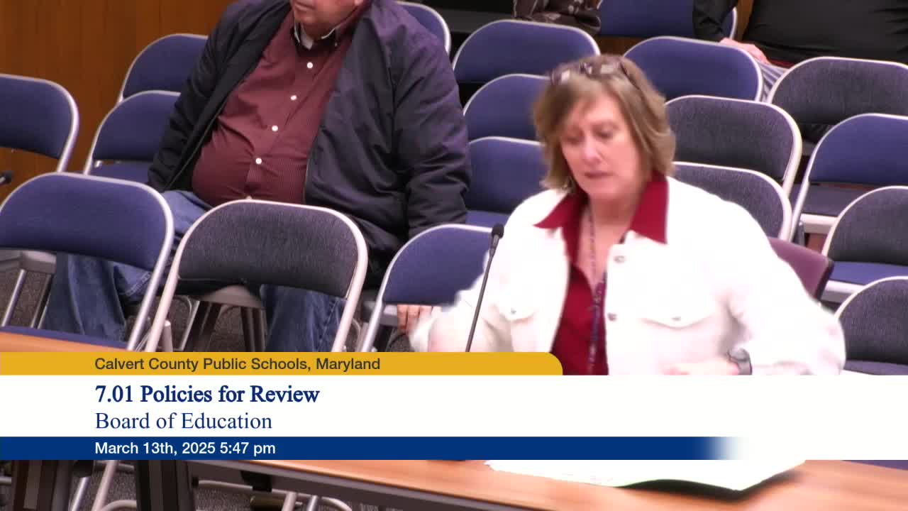 Calvert County board posts multiple policies for 30-day review; debates board role in procedure drafting and weapons reporting