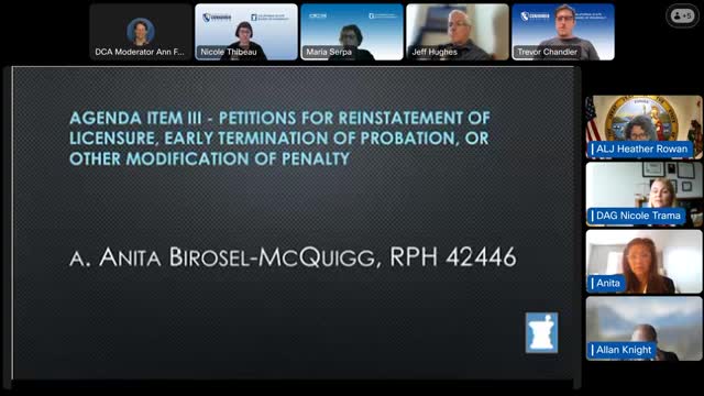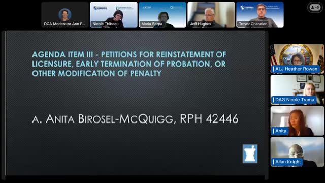 Former pharmacist Anita McQuigg seeks reinstatement after revocation; board probes rehabilitation and huge cost order