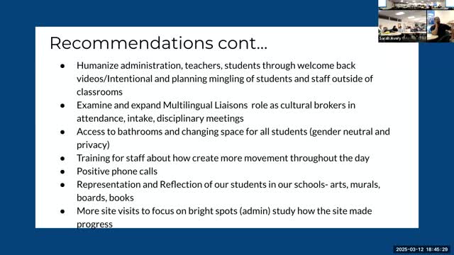 Gresham‑Barlow equity advisory presents school visits, recommends signage, equity teams and private spaces