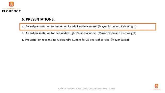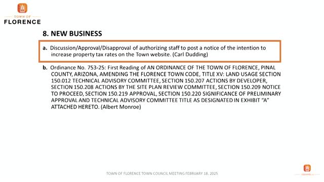 Florence council authorizes posting notice of intent to raise property-tax rates; approves consent items including Sun City Phase 2 map