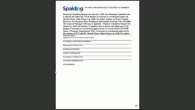 Votes at a glance: Spalding County Water Authority approves FY‑26 budget, PDB phase‑2 task order and multiple easement purchases