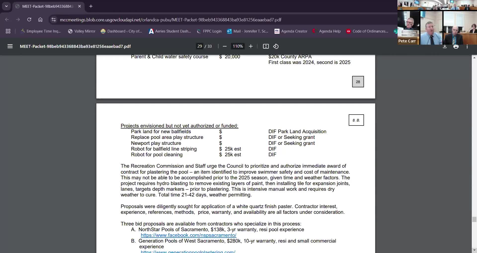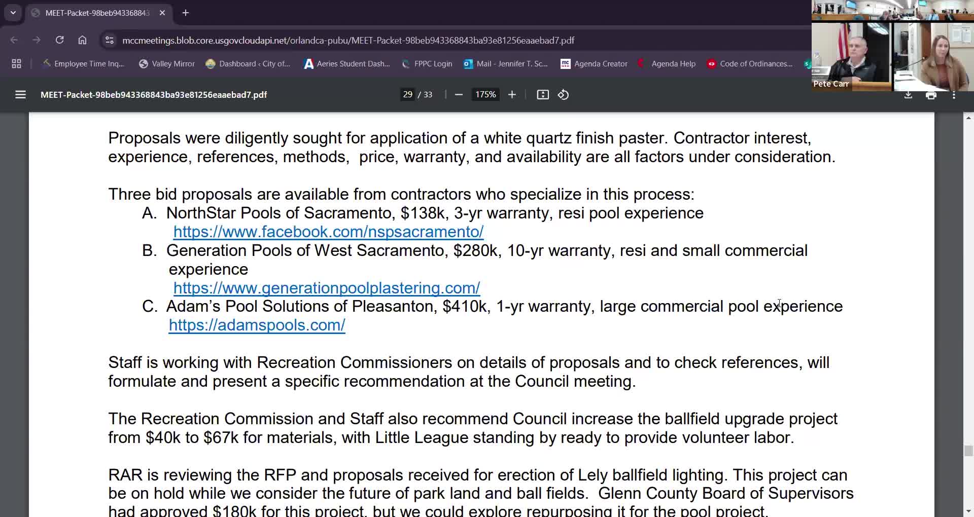 Council awards pool plastering contract and approves extra funds for ball-field upgrades