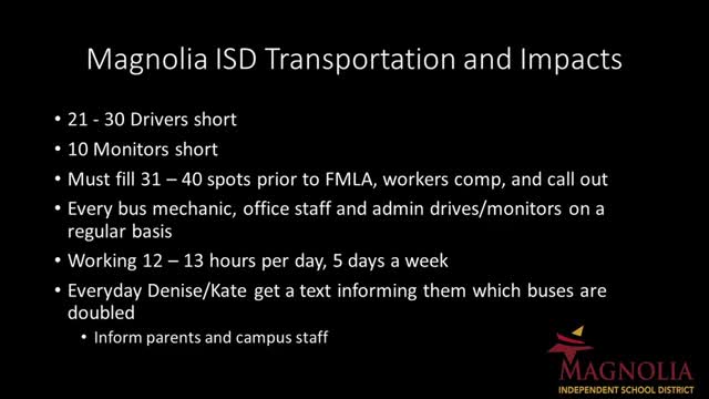 Magnolia ISD staff warn driver shortage is straining routes; district explores bell-time shifts to save costs