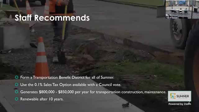 Sumner staff to pursue citywide transportation benefit district; council backs 0.1% sales-tax option as a first step