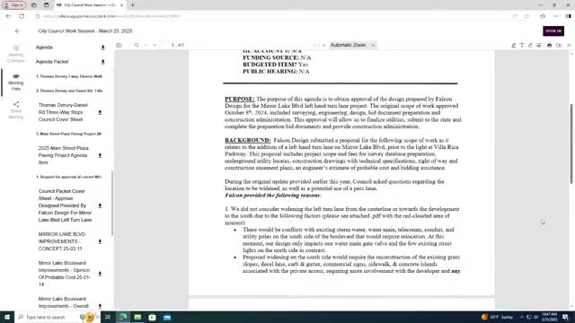 Council to consider Falcon Design plan for Mirror Lake Boulevard left-turn lane; staff recommends approval