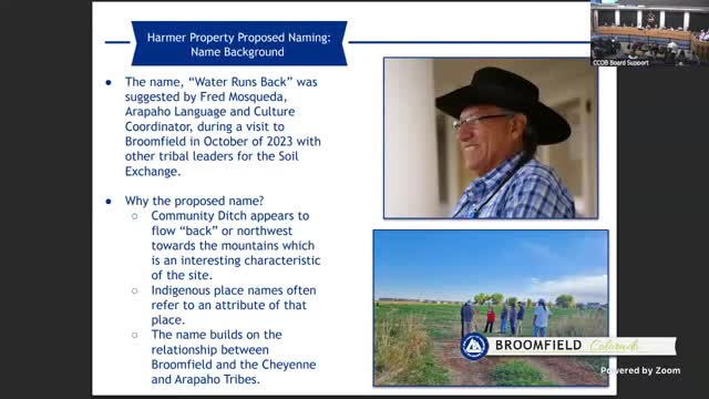 Council approves ‘‘Water Runs Back’’ as name for new open space after consultation with Cheyenne and Arapaho tribal representatives