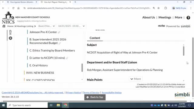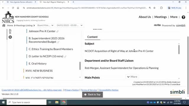 District staff brief board on NCDOT right‑of‑way purchase at Johnson Pre‑K; offer totals about $1.71 million