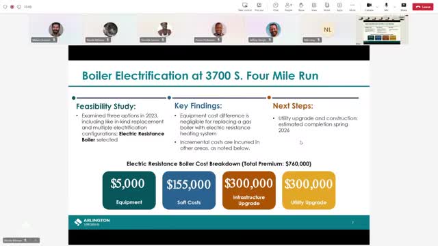 Facilities teams propose PAYGO and electrification investments; boiler switch at 4‑Mile Run carries $760,000 premium