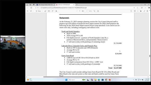 Council reviews candidate streets for $4 million 2026 bond; staff to explore state‑aid designation for Game Farm Road