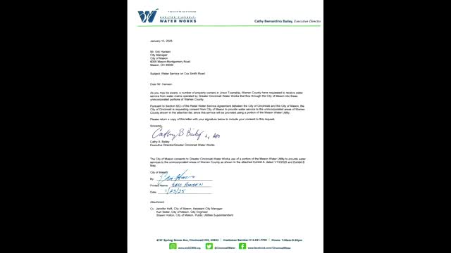County staff and residents discuss Cincinnati Water Works request to serve four parcels on Cox Smith Road; board to add territory‑release resolution to consent