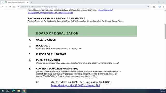 Sarpy County board approves equalization items, denies motor-vehicle tax exemption; several consent items pass 5-0