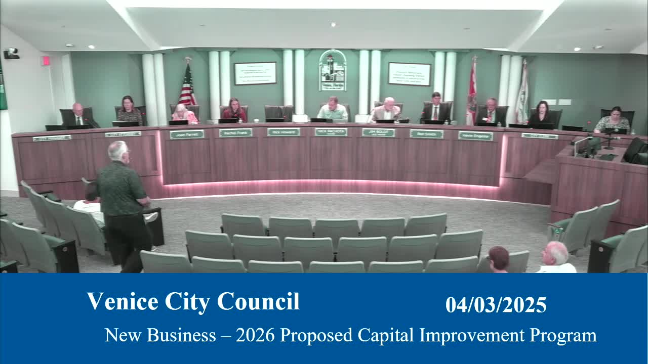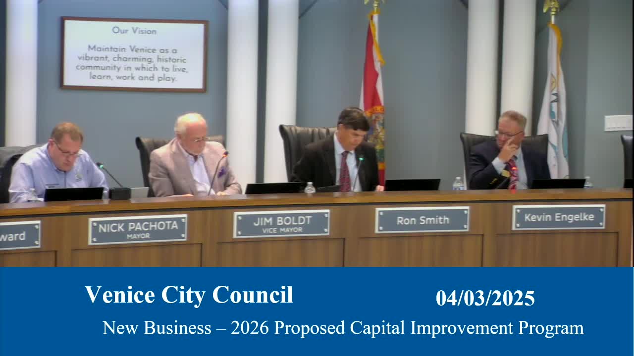 Venice council reviews five‑year CIP, weighs fast‑tracking beach parking and grants for jetty and renourishment