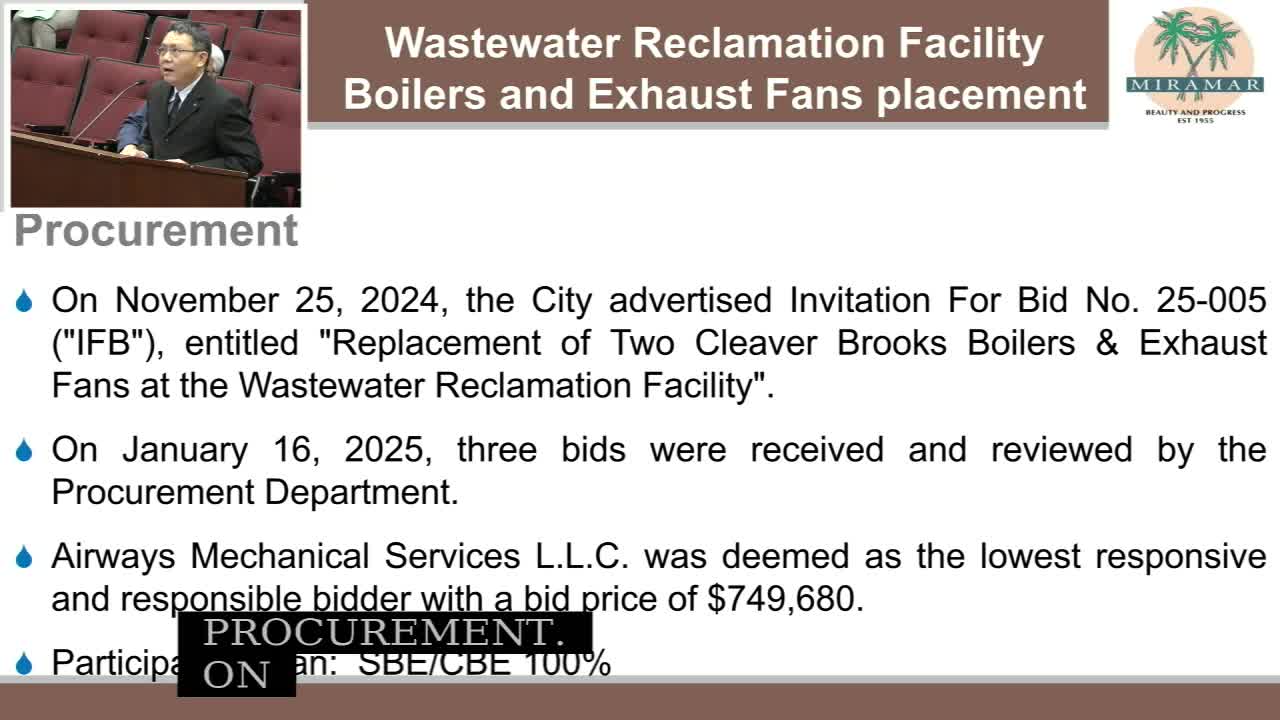 Miramar awards $849,680 contract to replace boilers, exhaust fans at wastewater facility