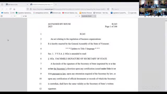 Committee reviews H.243 to harmonize business-registration law and give Secretary of State new authority to reject fraudulent filings