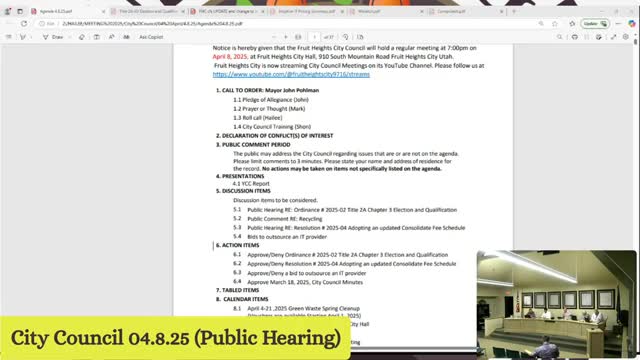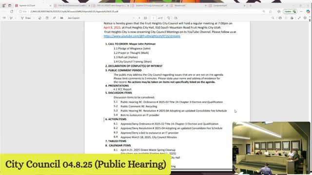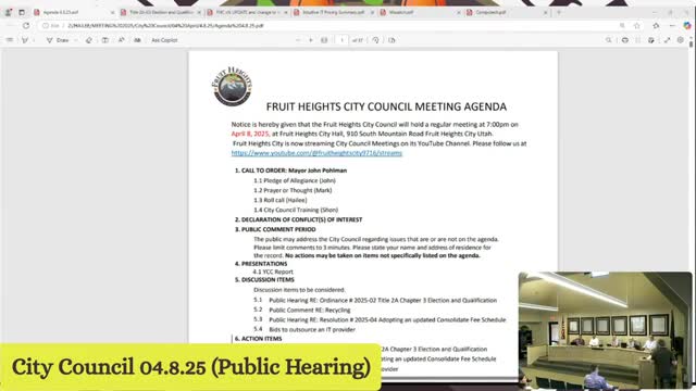 Fruit Heights debates consolidated fee schedule and proposed citywide recycling program; staff lays out costs and pilot details