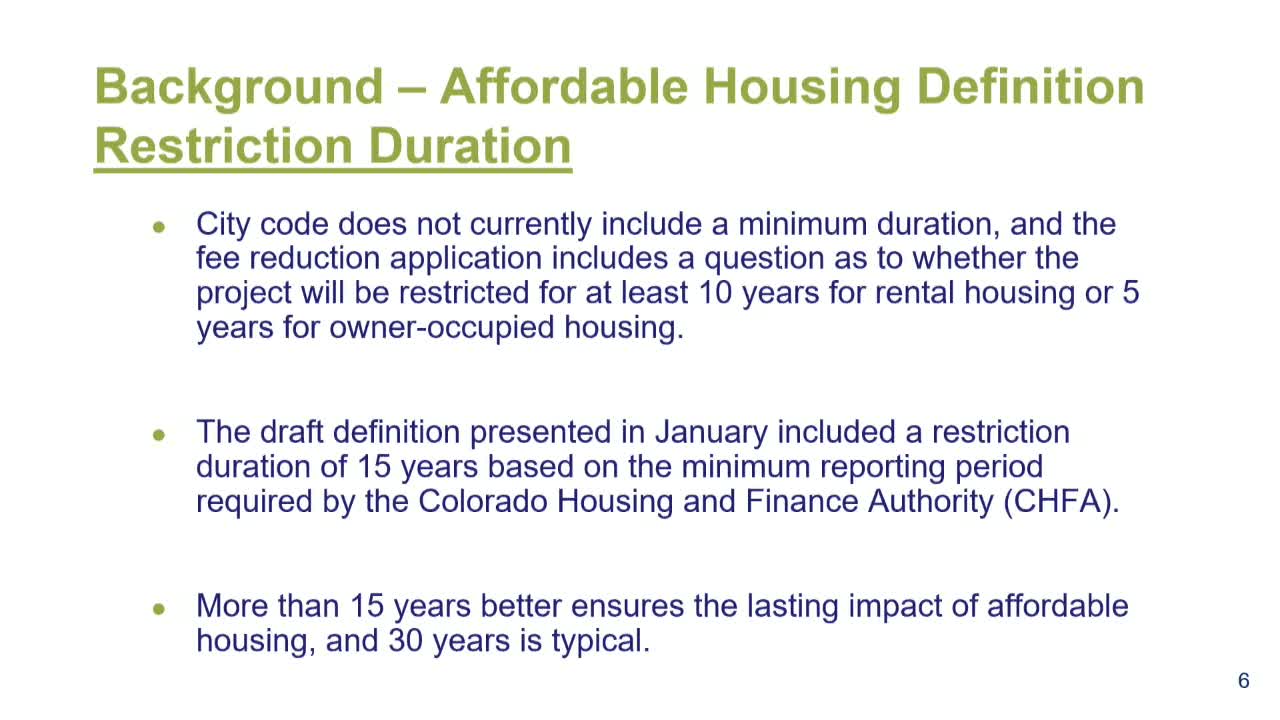 Council reviews draft affordable-housing definition and fee-reduction matrix; staff recommends 30-year minimum restriction