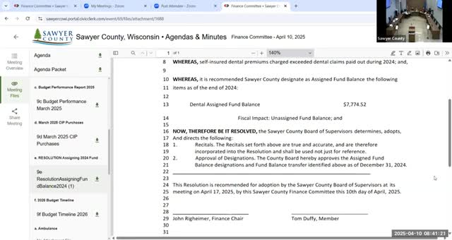 Sawyer County finance staff report stronger revenues; board assigns dental reserve and approves minutes