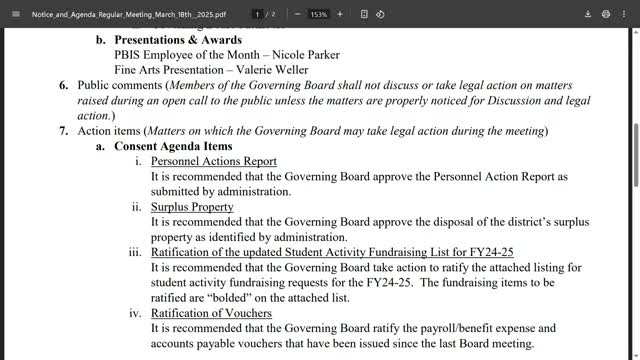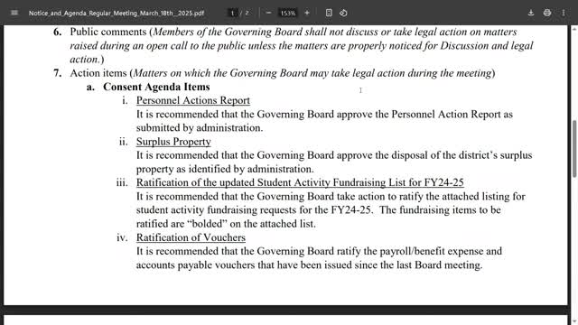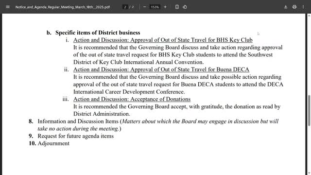 Board approves agenda, minutes, student travel and donations; all votes unanimous