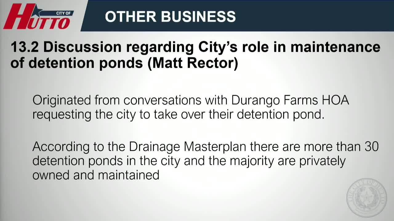 Council asks legal to update property-maintenance rules for detention ponds after pond failures and HOA concerns