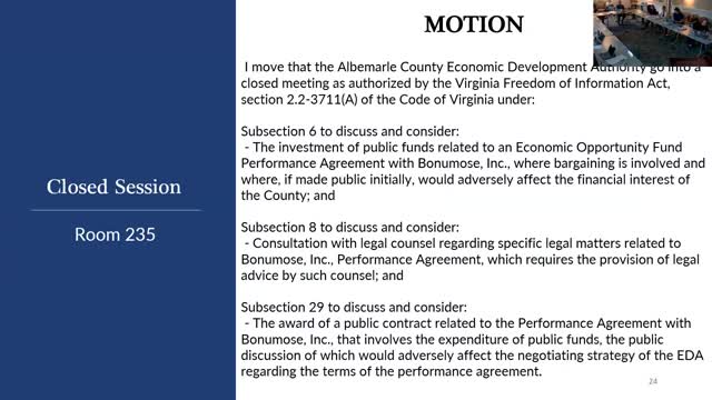 Votes at a glance: Albemarle County EDA approves remote participation, minutes and closed‑meeting certification
