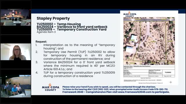 Board OKs temporary RV housing and construction yard for Stapley property; front-yard variance withdrawn
