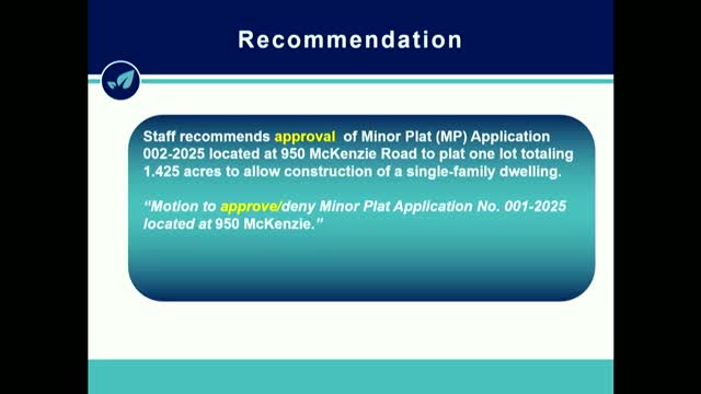 Commission approves minor plat for one-lot single-family home at 950 Mackenzie Road