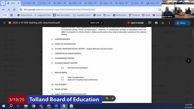 Tolland Board Adds Budget Discussion; Member Proposes Consolidating Middle‑ and High‑School Bus Routes