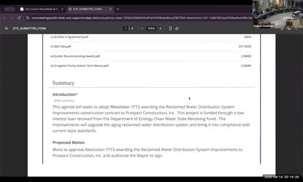 Council awards reclaimed-water distribution contract; project bids drive a budget shortfall staff say will require loan and CIP adjustments